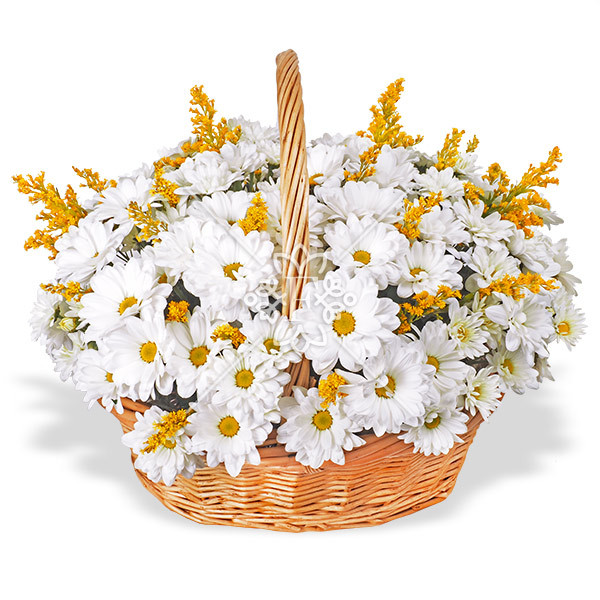 Очаровательные белоснежные хризантемы, словно легкое и пышное облако, уютно разместились в аккуратной плетеной корзине. Среди этого белого великолепия, солидаго напоминает  блики солнечных лучей! Композиция проста и очень гармонична.